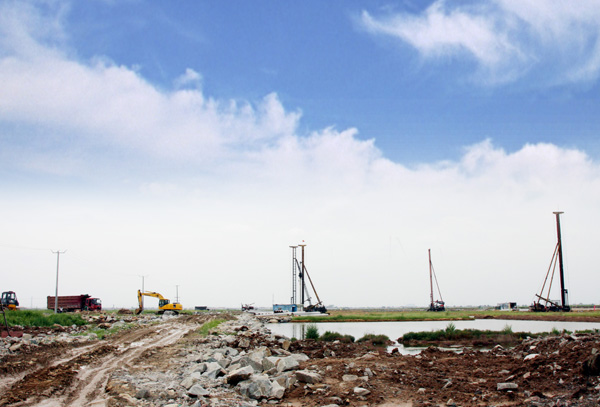 工程部徐經(jīng)理介紹到,中復新水源徐圩項目是徐圩新區基礎建設工程,包括一個(gè)面積為139.7畝的水廠(chǎng),一個(gè)面積為144畝的污水處理廠(chǎng)和外圍配套管網(wǎng)120公里,總工期14個(gè)月。項目部組建已經(jīng)一個(gè)月了,項目前期建設事宜正在按計劃推進(jìn),專(zhuān)家隊伍、管理隊伍已經(jīng)就位;樁基工程正在施工;土建工程已經(jīng)發(fā)出招標公告;設備正在編制清單和技術(shù)規格書(shū)。項目地處徐圩鹽田,地質(zhì)條件復雜,地表至負13米左右均為淤泥層,承載力差,累計要打下十萬(wàn)多米的樁基。