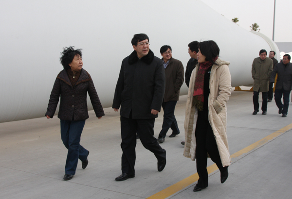 參觀(guān)期間,陰和俊一行興致勃勃的來(lái)到葉片堆場(chǎng)和四分廠(chǎng)生產(chǎn)車(chē)間,詳細了解了葉片生產(chǎn)工藝、原材料采購、葉片檢測等情況。今年10月,中復連眾重點(diǎn)投資建設的總面積3100平方米的葉片檢測中心正式啟用。該檢測中心主要針對風(fēng)機葉片性能進(jìn)行全面檢測,檢測項目包括葉片靜力試驗、疲勞試驗、固有頻率測量、阻尼測量、剛度分布測量、葉根連接結構靜強度等試驗。