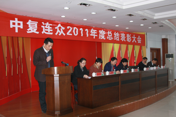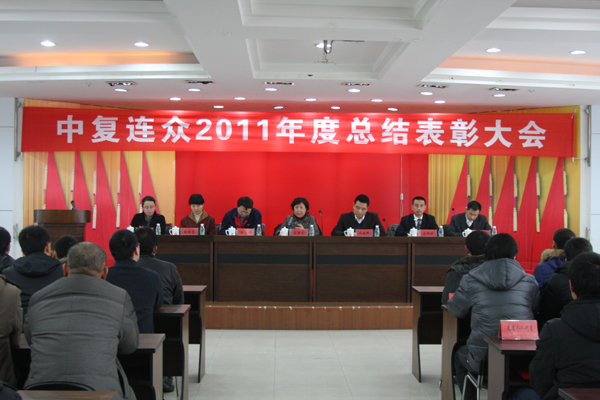 玉兔呈祥辭舊歲,金龍獻瑞迎新春。1月20日,中復連眾隆重舉行2011年度總結表彰大會(huì )??偨?jīng)理喬光輝作年度工作報告,董事長(cháng)任桂芳在會(huì )上作重要講話(huà),公司所有管理人員、車(chē)間班組長(cháng)以上人員參加了會(huì )議。會(huì )議由副總經(jīng)理南洋主持。