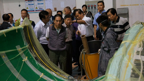 張定金首先介紹了中國復合材料集團有限公司基本情況,以及中復在連企業(yè)中復連眾復合材料集團有限公司、中復神鷹碳纖維有限責任公司、中復碳芯電纜科技有限公司的業(yè)務(wù)情況。隨后,馬力強主席和外部董事、高級顧問(wèn)一行冒著(zhù)大雨分別來(lái)到中復連眾、中復神鷹和中復碳芯參觀(guān)調研,切實(shí)了解企業(yè)生產(chǎn)經(jīng)營(yíng)狀況。在中復連眾風(fēng)力葉片生產(chǎn)線(xiàn)了解全球最長(cháng)兆瓦級風(fēng)電葉片生產(chǎn)條件和生產(chǎn)工藝,在我國首家室內風(fēng)力機葉片全性能檢測中心觀(guān)看葉片疲勞測試,在中復神鷹高性能碳纖維原絲生產(chǎn)線(xiàn)和碳化生產(chǎn)線(xiàn)了解生產(chǎn)過(guò)程和SYT45干噴濕紡工藝,并參觀(guān)了中復碳芯復合芯和導線(xiàn)車(chē)間等。